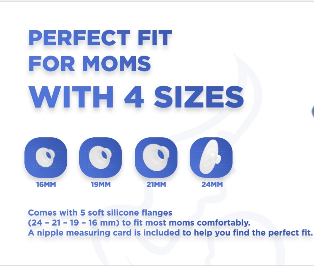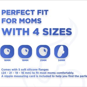 Comes with a 24mm flange and includes 21mm, 19mm, and 16mm inserts to fit most moms comfortably. A nipple measuring card is included to help you find the perfect fit.