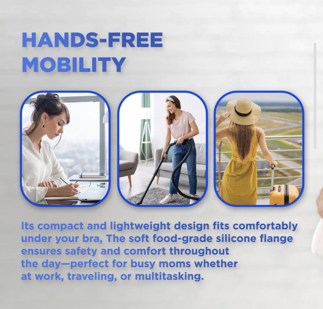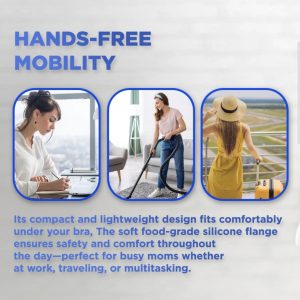 Its compact and lightweight design fits comfortably under your bra. The soft food-grade silicone flange ensures safety and comfort throughout the day—perfect for busy moms whether at work, traveling, or multitasking.