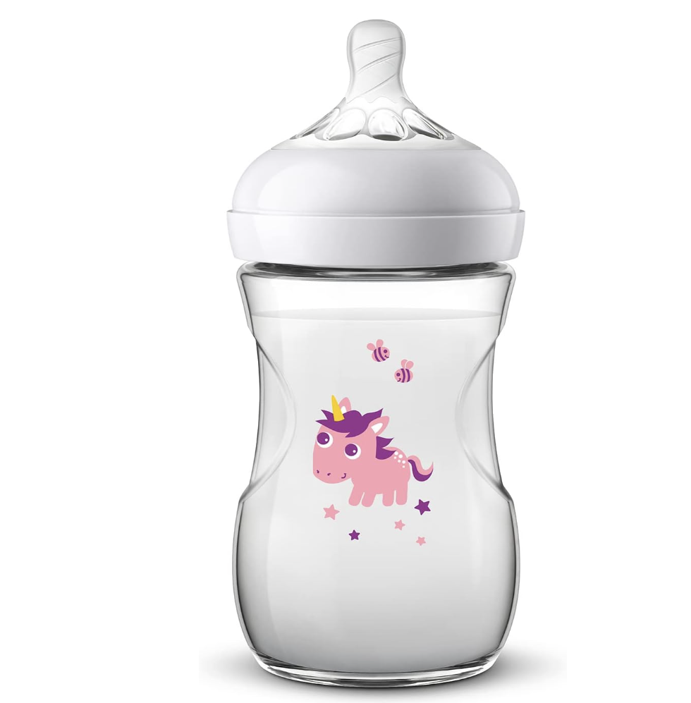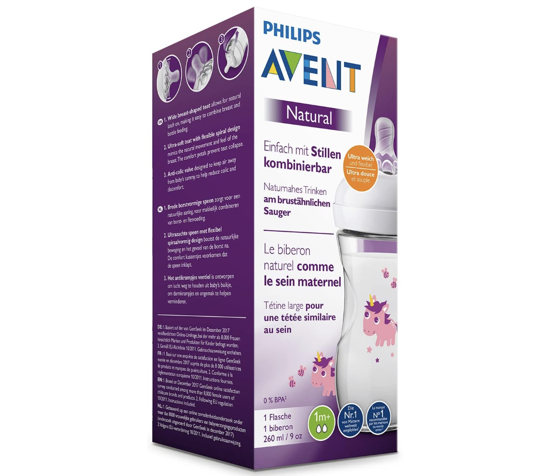 Easy to combine with breastfeeding. Our Natural bottle with an ultra soft teat more closely resembles the breast. The wide breast-shaped teat with flexible spiral design and comfort petals allows natural latch on and makes it easy to combine breast and bottle feeding. Features: Easy to combine with breastfeeding: Natural latch on: – 1 Bottle: 9 oz/260 ml – Slow-flow teat: 1m+ Natural latch on due to the wide breast shaped teat: – The wide breast shaped teat promotes a natural latch on similar to the breast, making it easy for your baby to combine breast and bottle feeding. Ultra soft teat designed to mimic the feel of the breast: – The teat has an ultra soft texture, designed to mimic the feel of the breast. Flexible spiral design combined with comfort petals: – Flexible spiral design, combined with our unique comfort petals to create a flexible teat, allowing for a more natural feed without teat collapse. Anti-colic valve designed to reduce colic and discomfort: – Anti-colic valve designed to keep air away from your baby’s tummy, to help reduce colic and discomfort. Teats with different flow rates available: – The Philips Avent Natural range offers different teat softness and increasing flow rates for every development stage of your baby. Ergonomic shape for maximum comfort: – Due to the unique shape, the bottle is easy to hold and grip in any direction for maximum comfort, even for baby’s tiny hands. Simple to use and clean, quick and easy assembly: – Wide bottle neck makes filling and cleaning easy. Only a few parts for quick and simple assembly. Compatible with the Philips Avent Natural range: – Mix and match our breast pump, bottle and cup parts, and create the product that works for you, when you need it! This bottle is BPA free: – The Philips Avent Natural bottle is made of BPA free* material (polypropylene).
